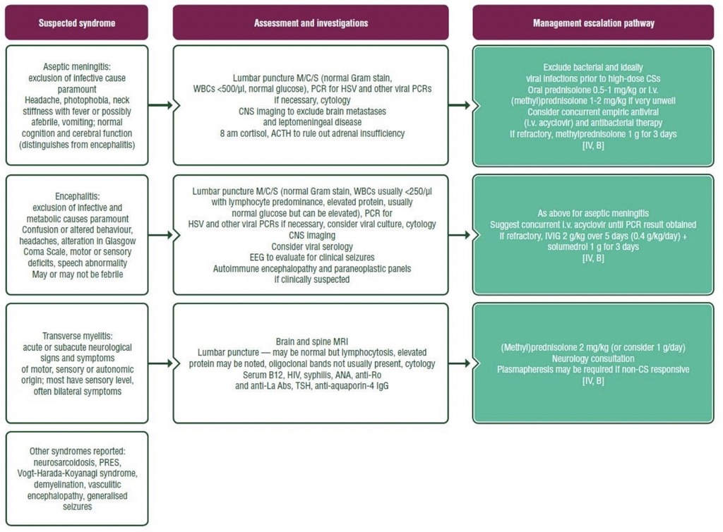 Purple: general categories or stratification; turquoise: combination of treatments or other systemic treatments; white: other aspectsof management.Abs, antibodies; ACTH, adrenocorticotrophic hormone; ANA, antinuclear antibody; CNS, central nervous system; CS,corticosteroid; EEG, electroencephalogram; HIV, human immunodeficiency virus; HSV, Herpes simplex virus; IgG, immunoglobulinG; IR, immune-related; i.v., intravenous; IVIG, intravenous immunoglobulin; M/C/S, microscopy, culture and susceptibility; MRI,magnetic resonance imaging; PRES, Posterior Reversible Leukoencephalopathy Syndrome; TSH, thyroid-stimulating hormone;WBC, white blood cell.Reproduced from Haanen et al